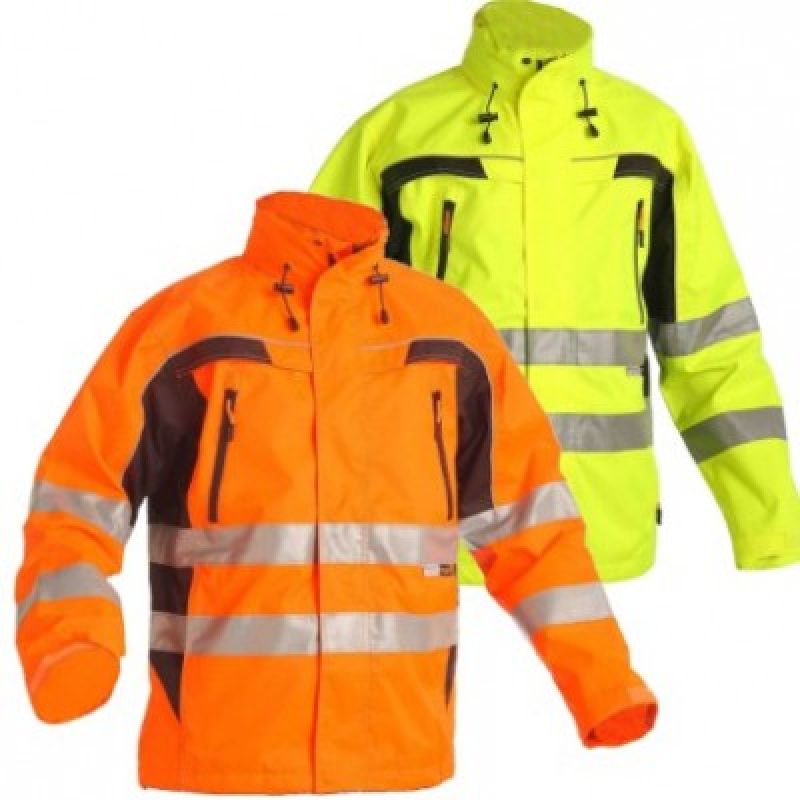 Reflexní bunda, 100% polyester s nánosem polyuretanu, odolnost proti průniku vody 2000 mm, paropropustnost 2000 g/m2/24hodin, podlepené švy, výstražný oděv s vysokou viditelností podle EN 471.