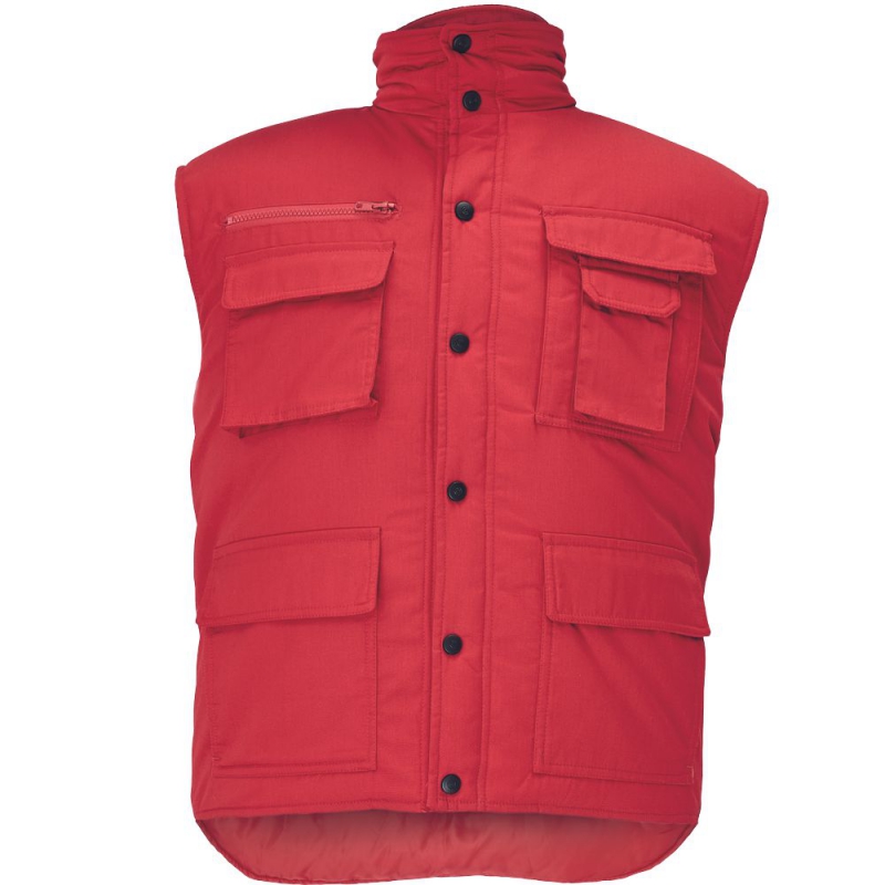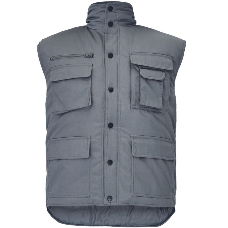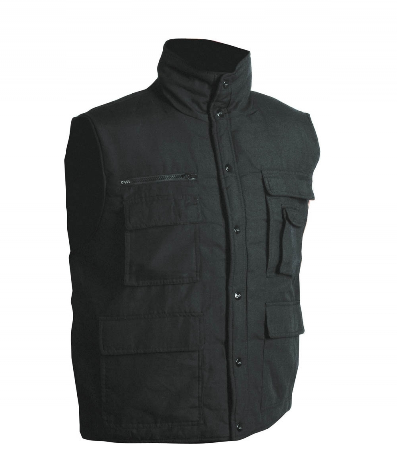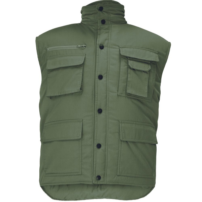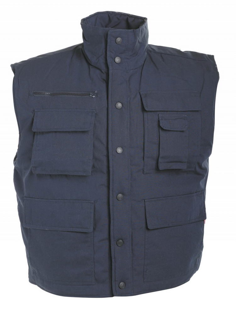 zateplená pánská zimní vesta se stojáčkem; prodloužený díl na zádech; zapínání na plastové druky; 2 velké přední multifunkční kapsy; 2 náprsní mutlifunkční kaspy.