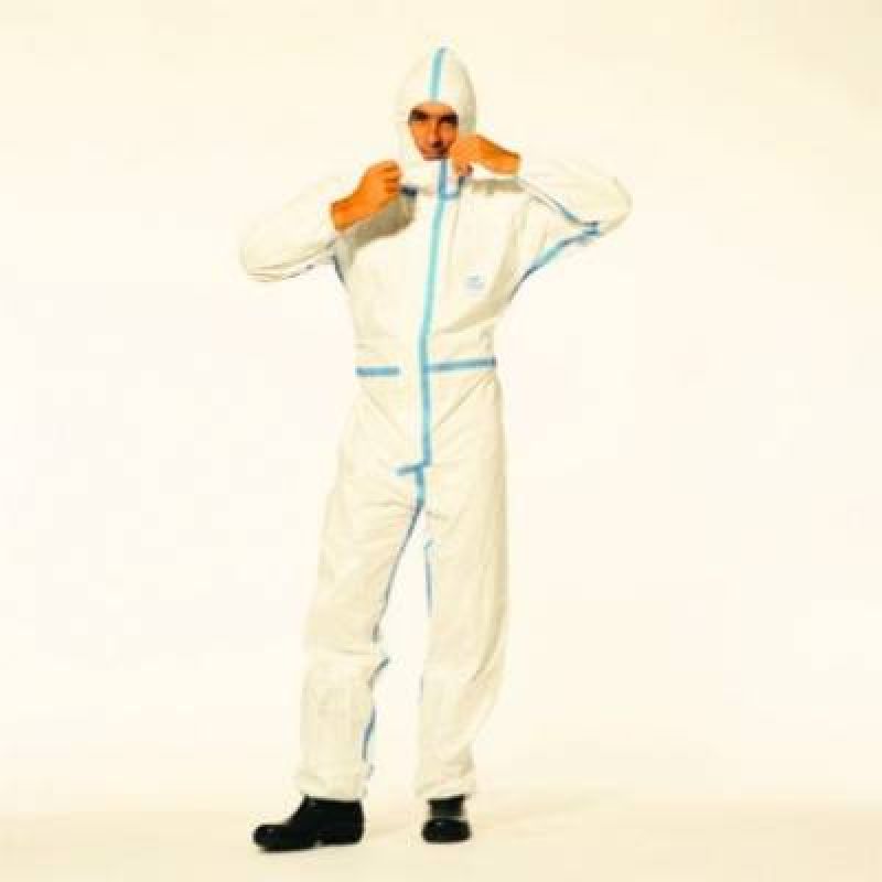 Ochranný oblek z netkaného polyethylénu s přelepenými švy, antistatický bez silikonů, odolává vodě, roztokům chemikálií, azbestu a prachu.