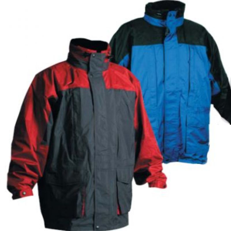 Nepromokavá zateplená bunda, materiál PVC/polyester, uvnitř síťovina pro vyšší provzdušnění, odepinatelná vniřní teplá vložka.