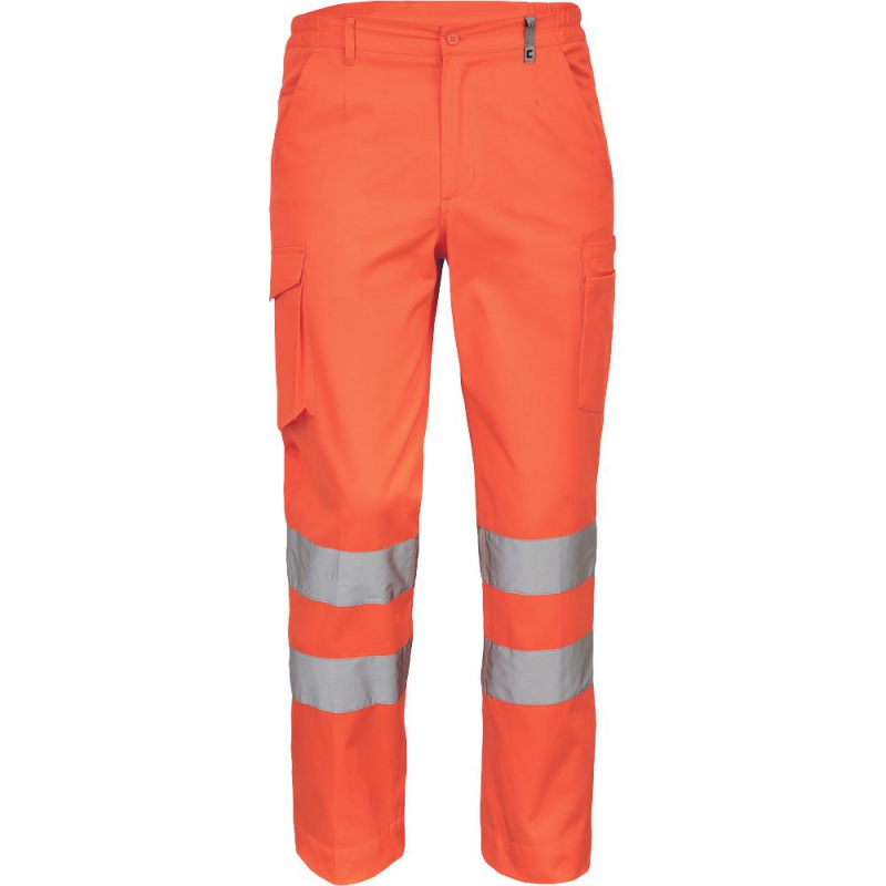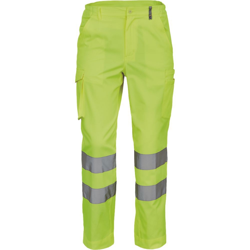 pánské lehké full HI-VIS pracovní kalhoty a reflexními pruhy na nohavicích, elastický pas; 2 boční kapsy, 1 kapsička na mince; 2 multifunkční stehenní kapsy; 2 zadní kapsy; nastavitelná délka nohavic.