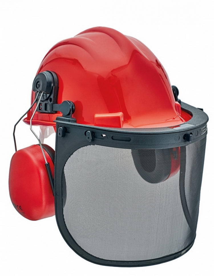 Lesnický komplet skládající se z: oranžové přilby z ABS s nastavitelnou velikostí posuvným páskem pro velikost 55–62 cm a 4 bodovým uchycením na PE náhlavním kříži, držákem štítu, drátěným štítem a červenými ochrannými sluchátky, 26 SNR, EN 352-3: 2002. Přilba – EN 397: 2012+A1: 2012, ANSI Z89.1