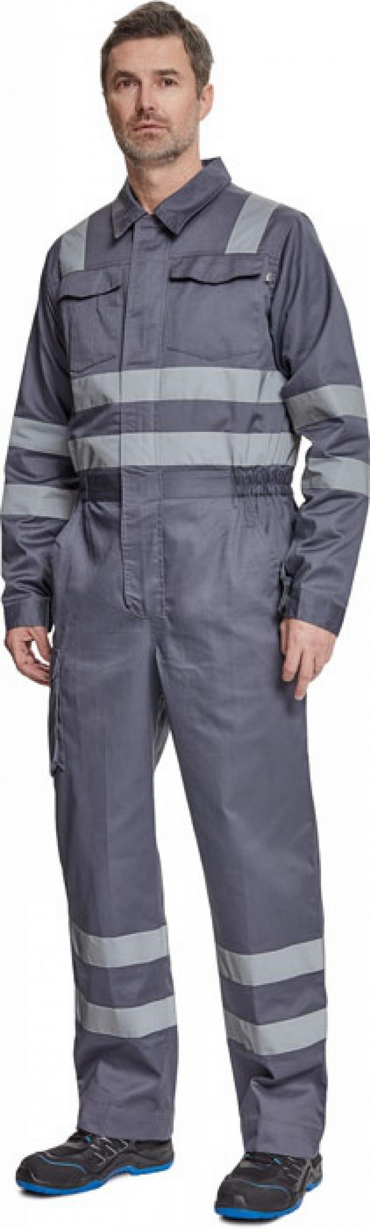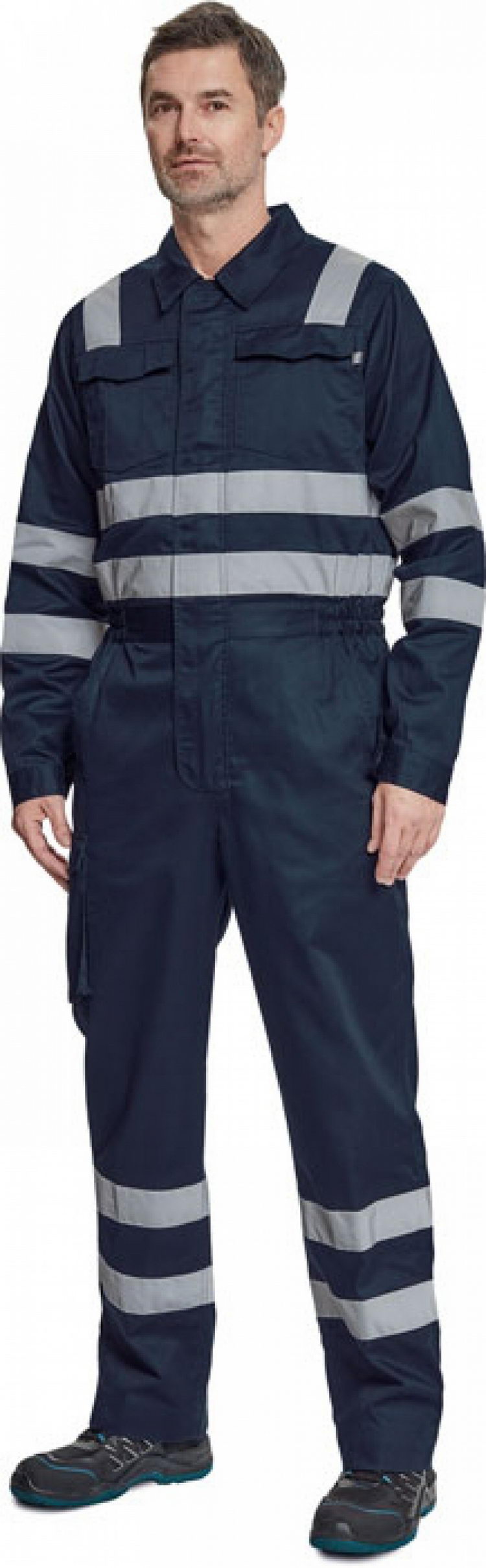 pánský pracovní overal s retroreflexním pruhy přes ramena, v bocích, na rukávech a nohavicích, elastický pas, zapínání na zip kryté légou na suchý zip, 2 postranní kapsy + 1 kapsička na drobné, 1 multifunkční stehenní kapsa, 2 náprsní kapsy s klopou, 2 zadní kapsy, nastavitelná délka nohavic